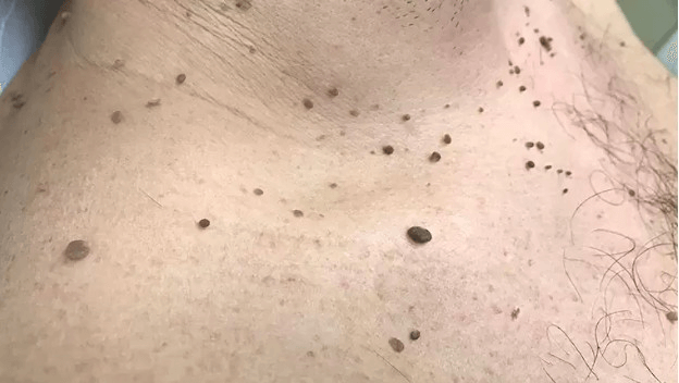1. Una situazione a lieto fine. La paziente lamentava abbondanti eruzioni cutanee, che si sono rivelate essere papillomi. Abbiamo avuto la fortuna di rimuoverli tutti prima che la paziente sviluppasse un cancro della pelle.